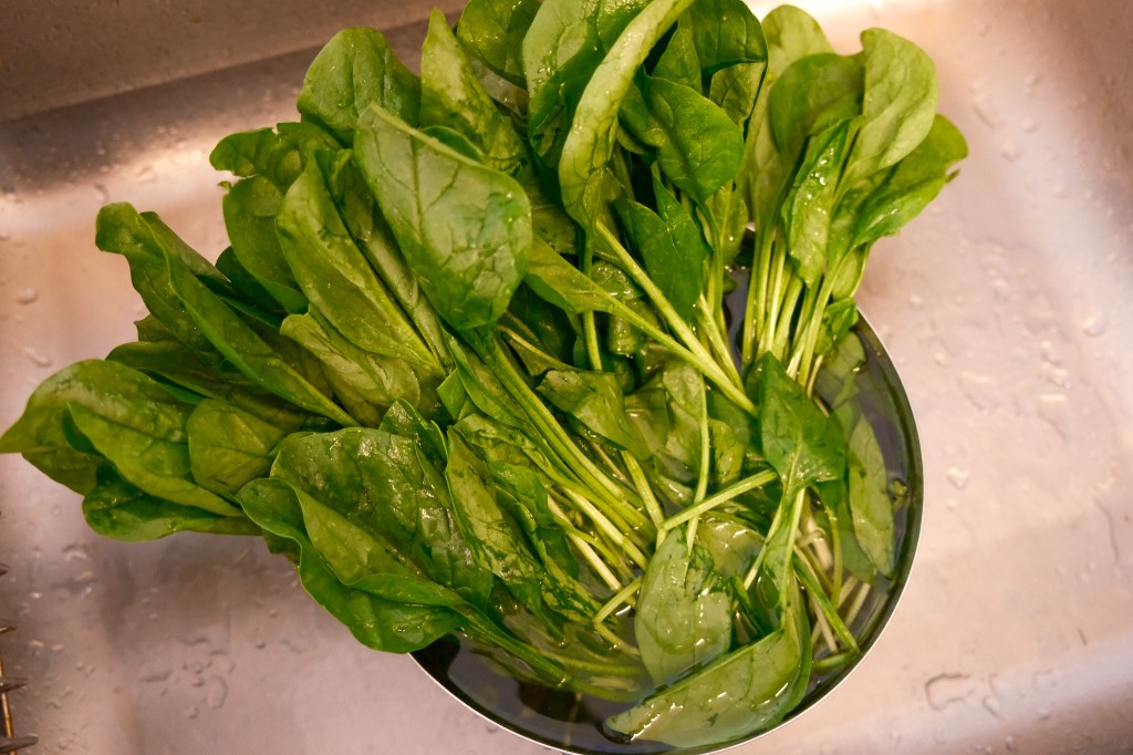1. Rinse the spinach thoroughly. 将菠菜洗净。