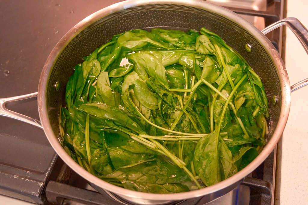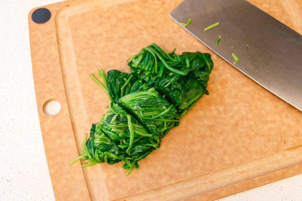 2. Bring a pot of water to a boil and blanch the spinach for 1 minute, then remove. 水烧开后放入菠菜焯水 1 分钟,捞出。