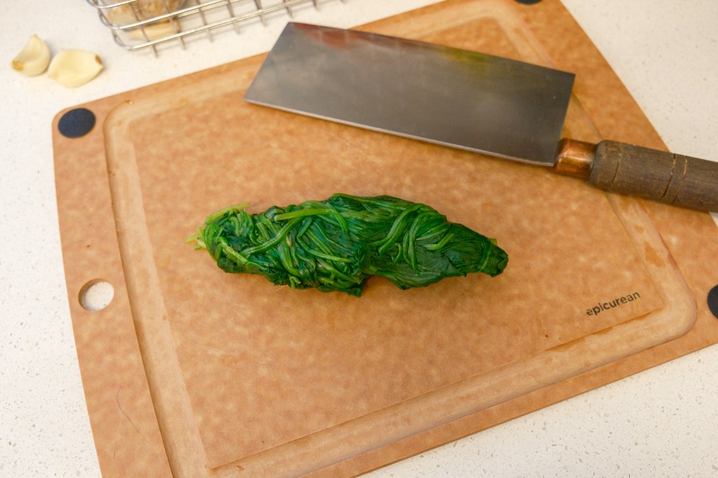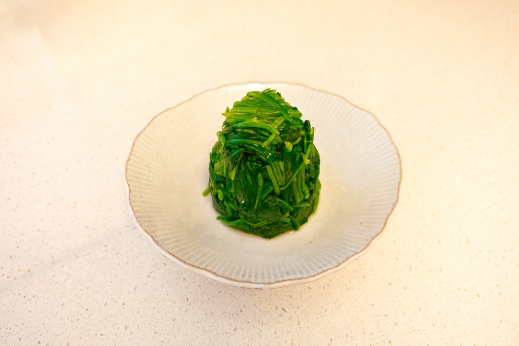 5. For a nicer presentation, press the spinach into a small container (such as a glass) and invert it onto a plate. 为了摆盘美观,可将菠菜压入一个小容器(如玻璃杯)后倒扣在碗中。