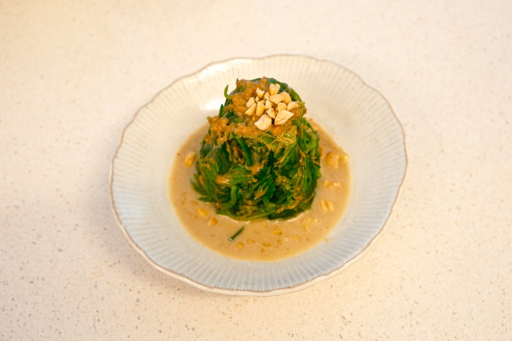 7. Pour the prepared dressing over the spinach and sprinkle with white sesame seeds or crushed peanuts before serving. 将调好的芝麻酱汁淋在菠菜上,最后撒些白芝麻或花生碎即可上桌。
